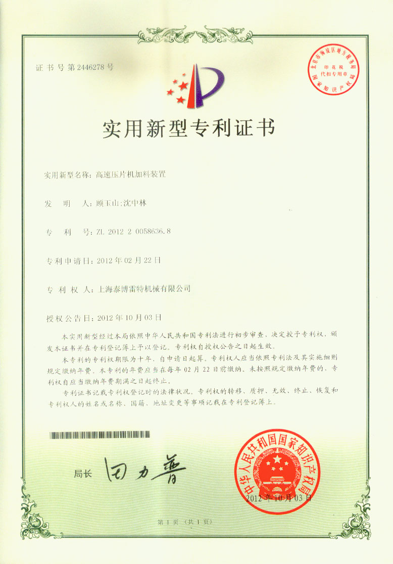 上海泰博雷特高速壓片機加料裝置專利,本實用新型涉及一種壓片機,具體的說一種高速壓片機加料裝置,包括加料器上蓋板,以及與加料器上蓋板連接的加料器底板,其特征在于:加料器上蓋板上設(shè)有進(jìn)料口,且上蓋板與加料器底板之間形成腔體,腔體內(nèi)設(shè)有加料裝置,并通過加料器中盤固定;所述加料裝置包括一個計量葉輪,一個上葉輪,一個充填葉輪,每組葉輪的葉輪軸的軸部設(shè)有第一齒輪齒輪,且每組葉輪的葉輪軸之間通過傳動部件進(jìn)行連接;所述計量葉輪的葉輪軸端部設(shè)有傳動接套。本實用新型同現(xiàn)有技術(shù)相比,解決了高速壓片機在高速壓片情況下完成加料、充填和計量的過程。